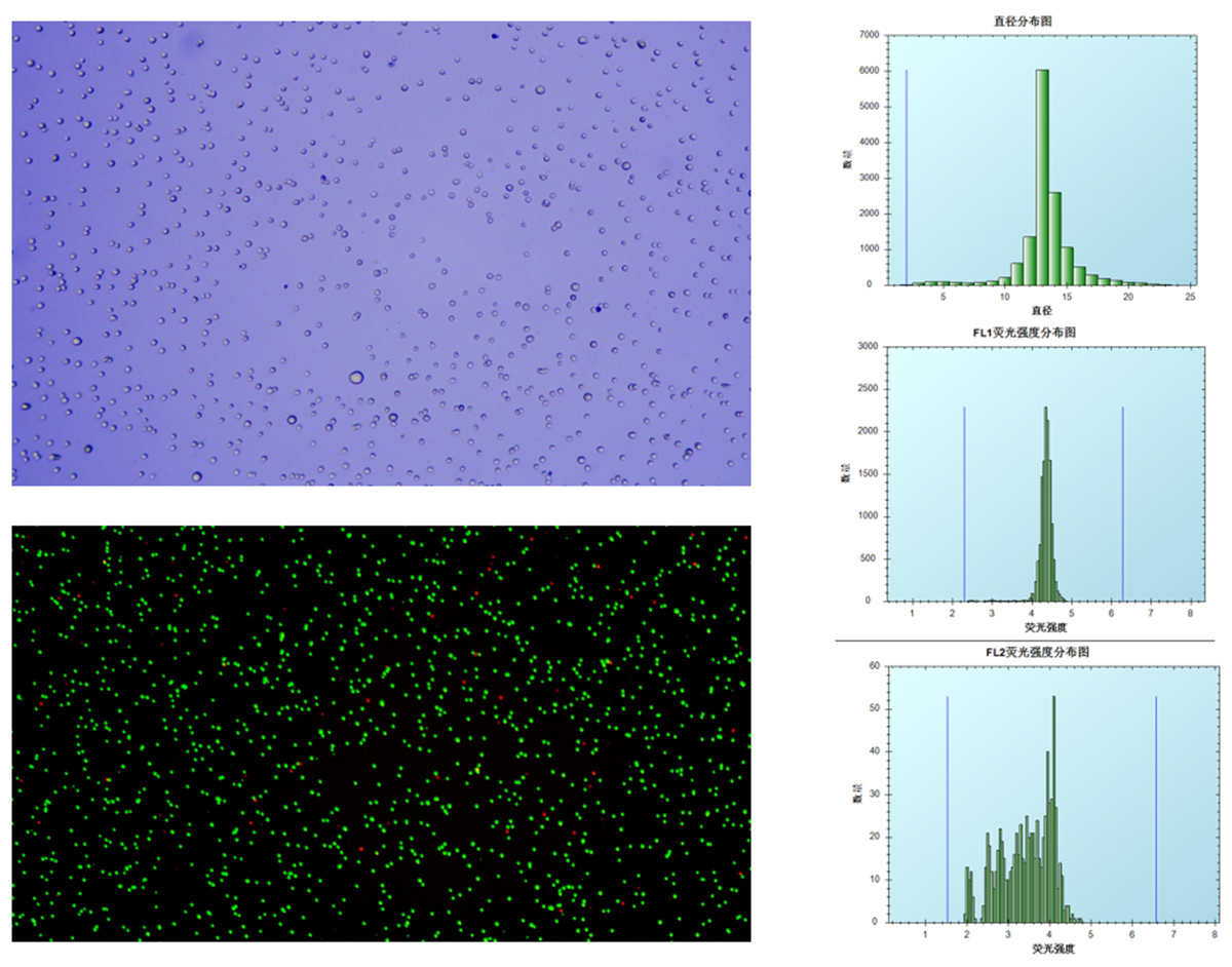 多种数据展示形式,包括图片,直径分布图,荧光强度分布图等,从中了解更多的培养中的细胞信息。柱状分布图中,可通过设门的方式来解析细胞的状态。